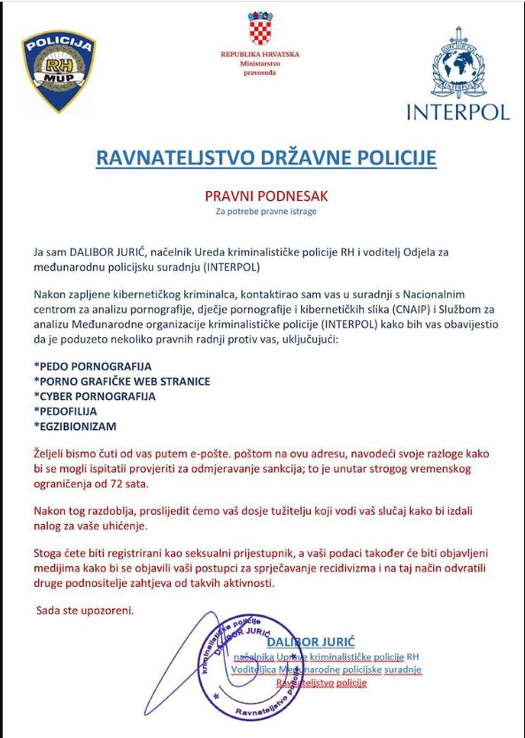 U toj poruci nepoznata se osoba predstavljala kao rukovoditelj organizacijske jedinice Uprave kriminalističke policije, a primateljima su napisali da su osumnjičeni za više različitih kaznenih djela. Od primatelja traže da odgovori na poruku, a sve kako bi zauzvrat izvukli novac.